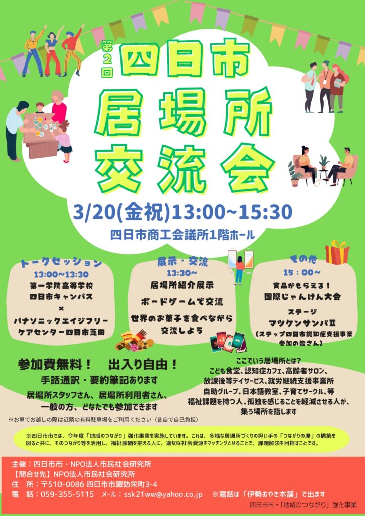 3月20日(金)、13:00~15:30、四日市商工会議所1階ホールで、第2回四日市居場所交流会を行います。様々な居場所の紹介や、世界のお菓子やじゃんけん大会、認知症の方々によるマツケンサンバなど盛りだくさんです。居場所関係者に関わらず、どなたでも参加できます。お気軽にご参加ください。